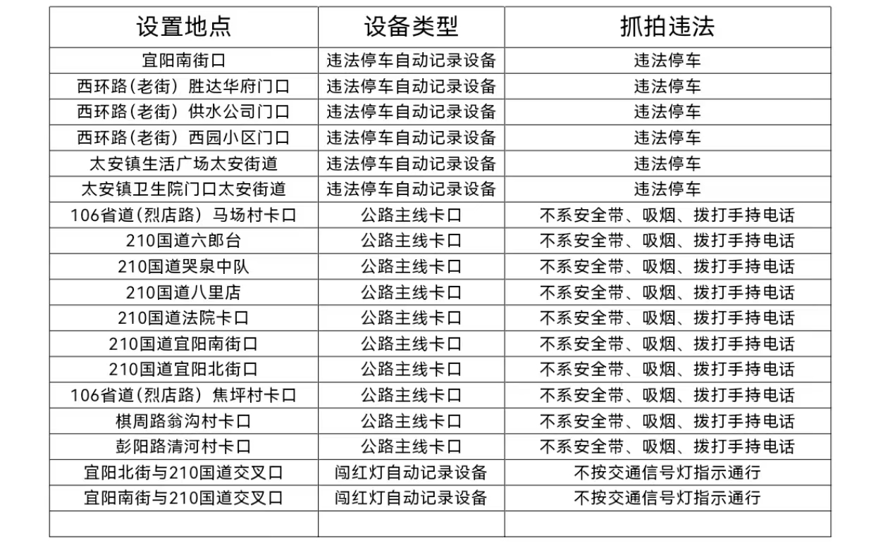 为进一步提升我县道路交通管理水平,创造良好的道路交通环境,根据《中华人民共和国道路交通安全法》及其实施条例等法律法规和相关标准,宜君县公安局交巡警大队决定自2025年01月15日起,正式启用宜君县公安局交巡警大队辖区210国道、县城街道及辖区其他部分路口路段的交通技术监控设备,实施抓拍各类违法行为,现将准备启用的固定式交通技术监控设备设置地点公示如下: