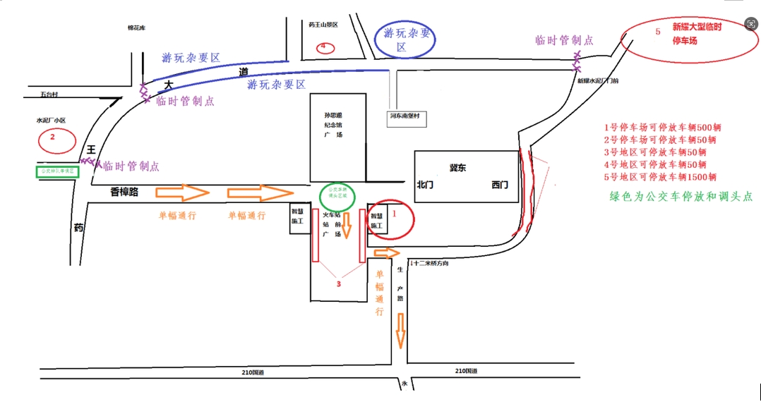 4、沿药王大道方向游玩群众请将车辆停放在耀州东火车站道路两侧停车位或智慧停车停车场,沿生产路方向游玩群众请将车辆停放在新耀水泥厂临时停车场。同时也请广大群众尽量绿色出行,庙会期间公交公司将会安排客运班车往返运营,为避免路上拥挤,尽量选择公共交通前往,不要乘坐黑车、报废车、超员车、农用车、三轮车、拖拉机等车辆。
