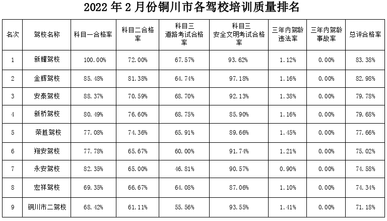 为进一步做好驾考培训工作,根据陕西省公安厅交警总队《关于进一步做好驾考培训质量考核和考试员专业培训相关工作的通知》精神,结合各驾校学员各科目考试合格率、3年内驾龄驾驶人发生交通事故率、3年内驾龄驾驶人交通违法率,铜川市公安局交警支队车管所对各驾校进行了综合分析和排名,现将各驾校培训质量排名公告如下: