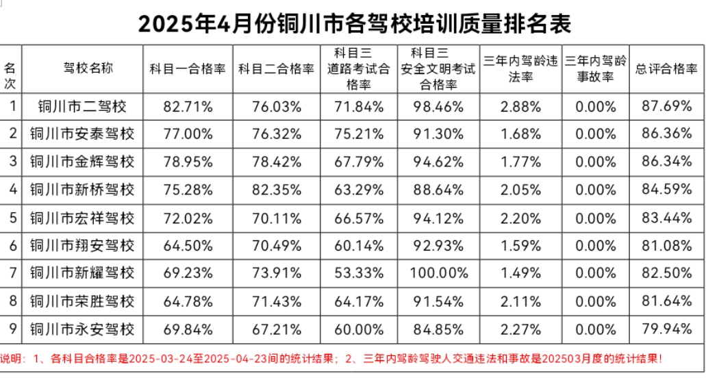 为进一步做好驾考培训工作,根据陕西省公安厅交警总队《关于进一步做好驾考培训质量考核和考试员专业培训相关工作的通知》精神,结合各驾校学员各科目考试合格率、3年内驾龄驾驶人发生交通事故率、3年内驾龄驾驶人交通违法率,铜川市公安局交警支队车管所对各驾校进行了综合分析和排名,现将排名公告如下: