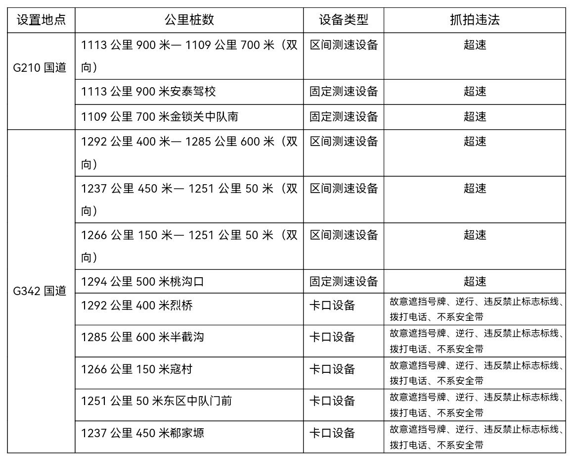 为进一步提升我区国省道道路交通安全水平,为群众出行创造安全的道路交通环境,根据《中华人民共和国道路交通安全法》及其实施条例等法律法规和相关标准,铜川市公安局交警支队第二大队决定自2025年5月20日起,启用210国道、342国道铜川市印台段交通技术监控设备,实时抓拍各类违法行为。