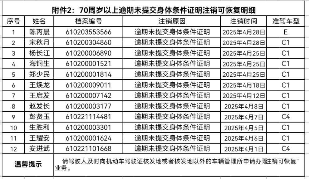 2、“70周岁以上逾期未提交身体条件证明”驾驶证注销可恢复明细