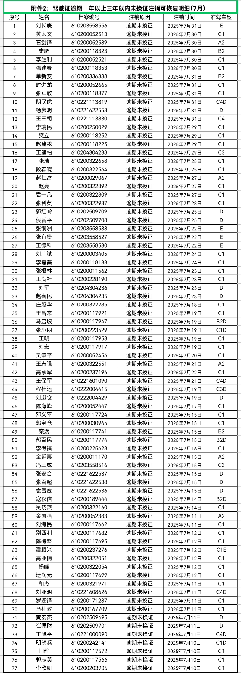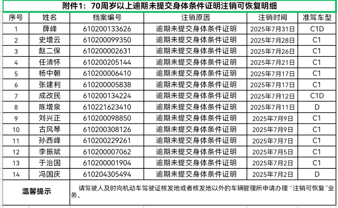 附:1、“70周岁以上逾期未提交身体条件证明”驾驶证注销可恢复明细