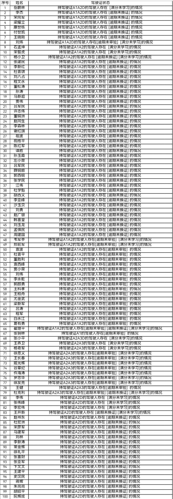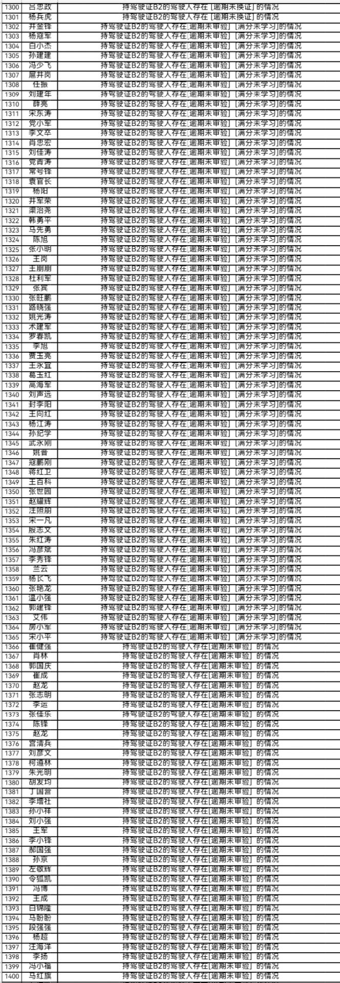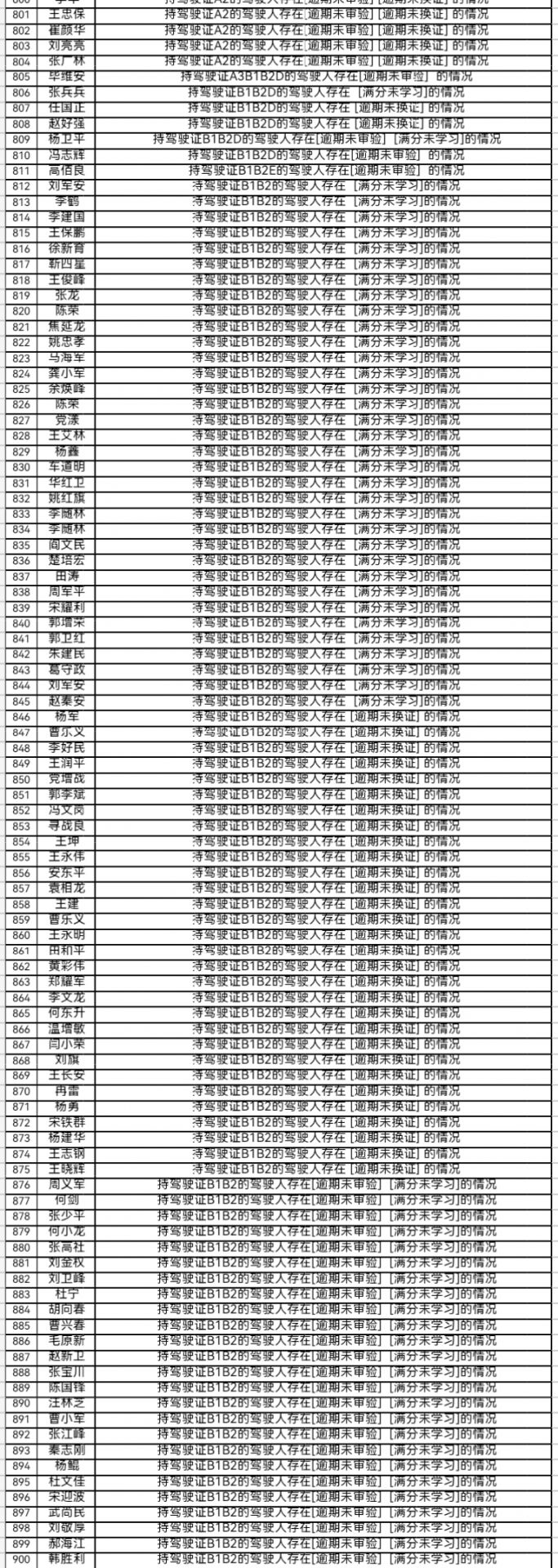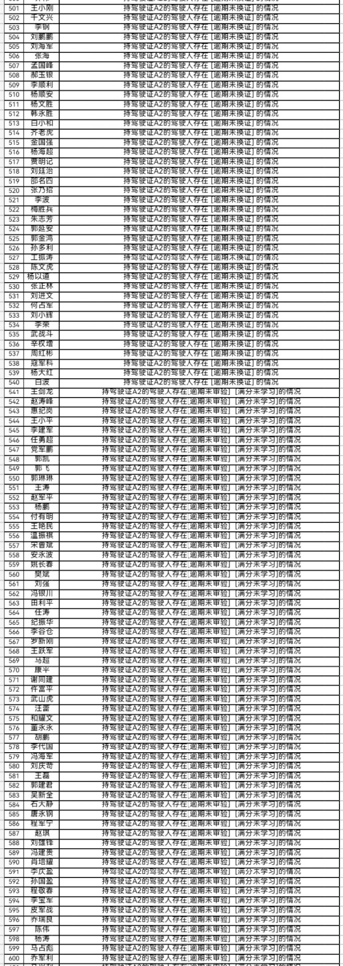 下列AB类机动车驾驶证状态存在“逾期未换证、未审验、满分未学习”情况,为了不影响驾驶证的正常使用,请驾驶人及时向机动车驾驶证核发地或核发地以外的车辆管理所办理换证、审验、满分学习业务(已办理请忽略)。
