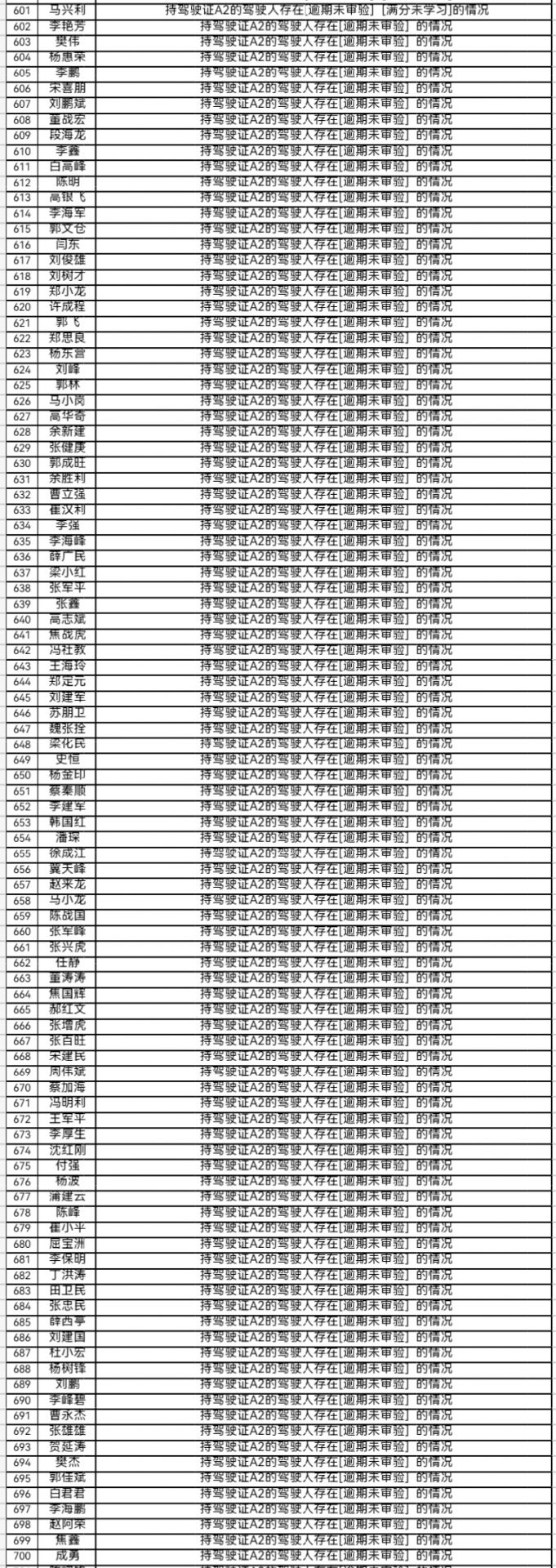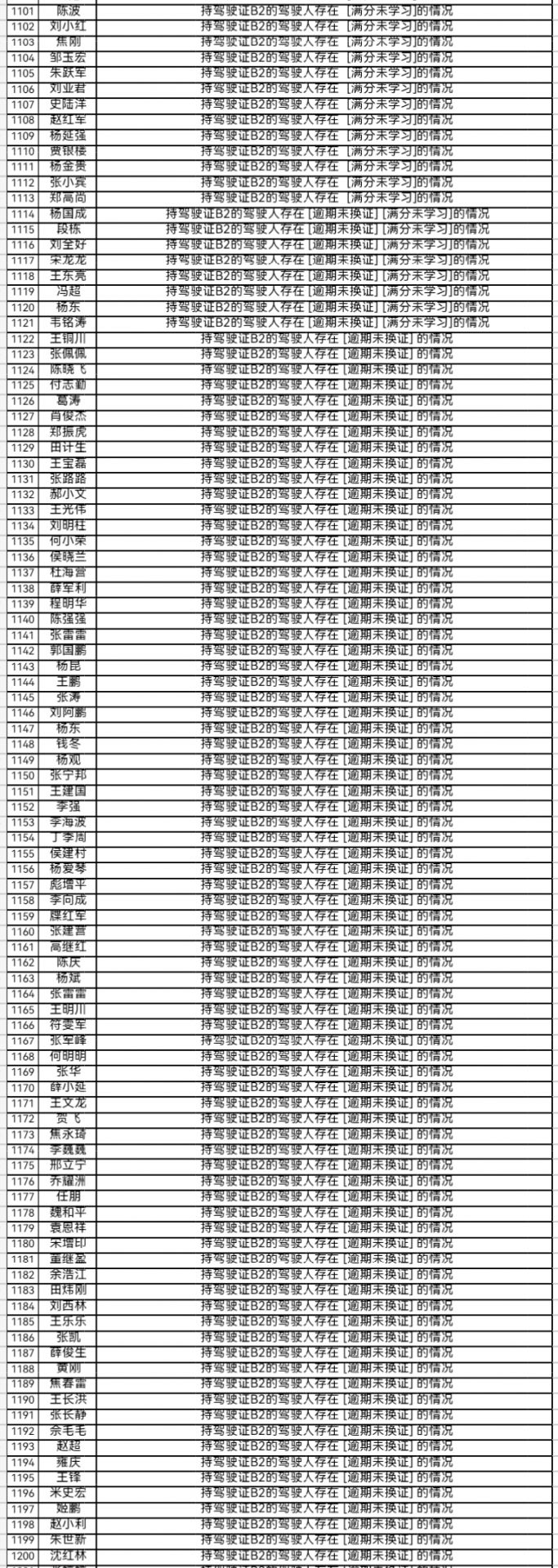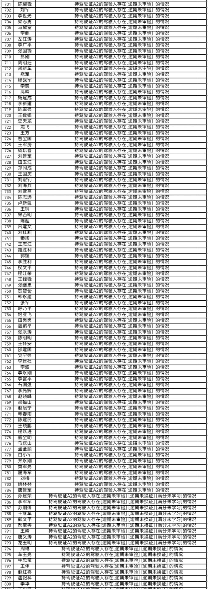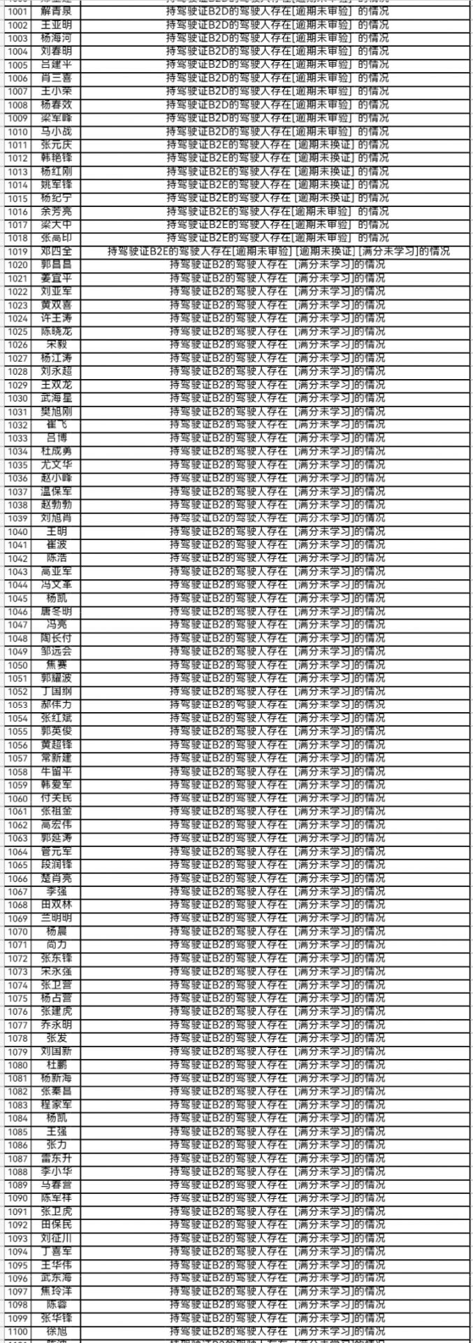 下列AB类机动车驾驶证状态存在“逾期未换证、未审验、满分未学习”情况,为了不影响驾驶证的正常使用,请驾驶人及时向机动车驾驶证核发地或核发地以外的车辆管理所办理换证、审验、满分学习业务(已办理请忽略)。