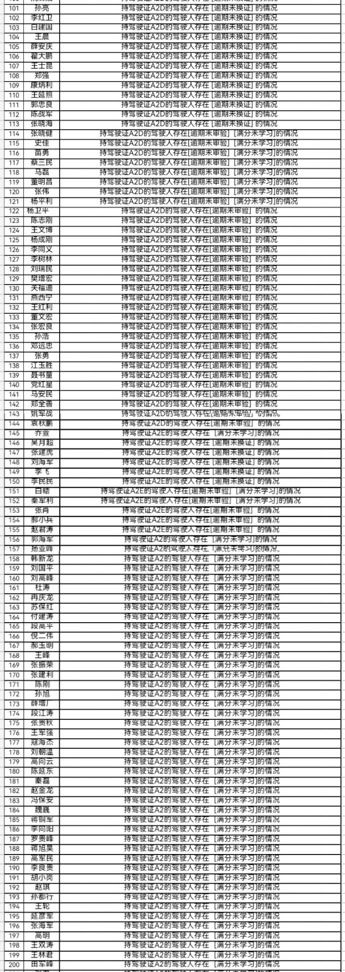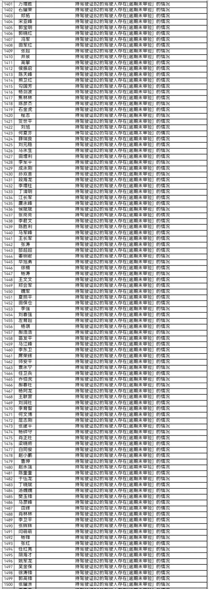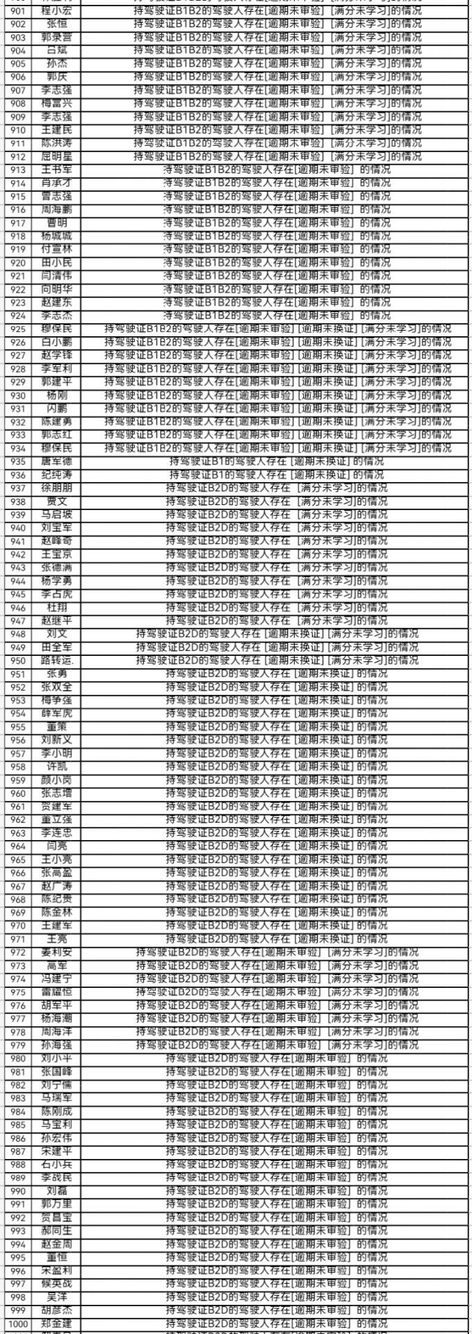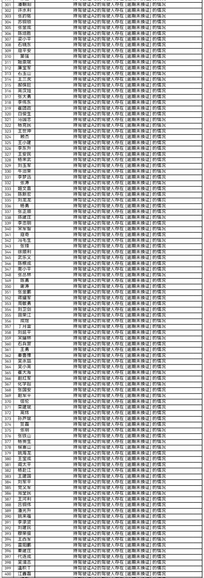 下列AB类机动车驾驶证状态存在“逾期未换证、未审验、满分未学习”情况,为了不影响驾驶证的正常使用,请驾驶人及时向机动车驾驶证核发地或核发地以外的车辆管理所办理换证、审验、满分学习业务(已办理请忽略)。