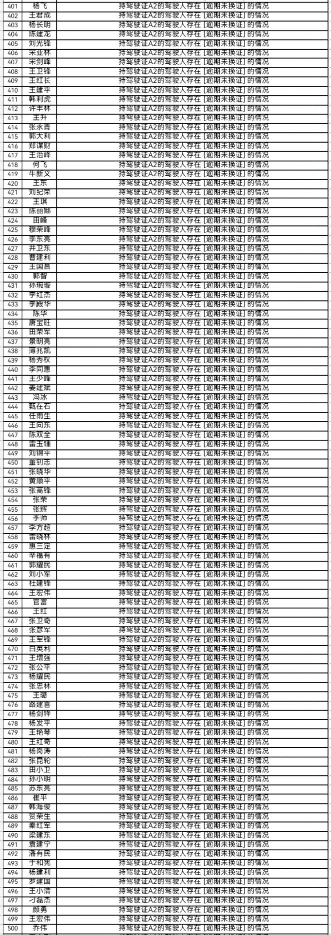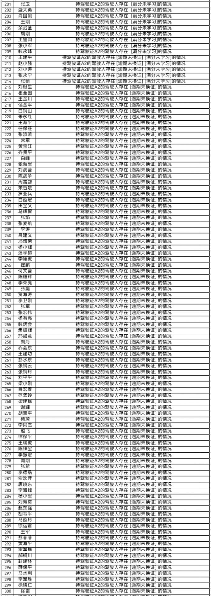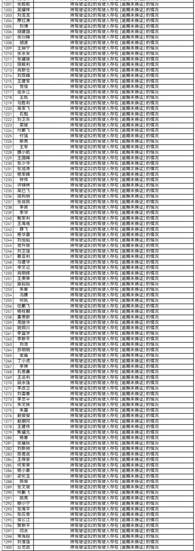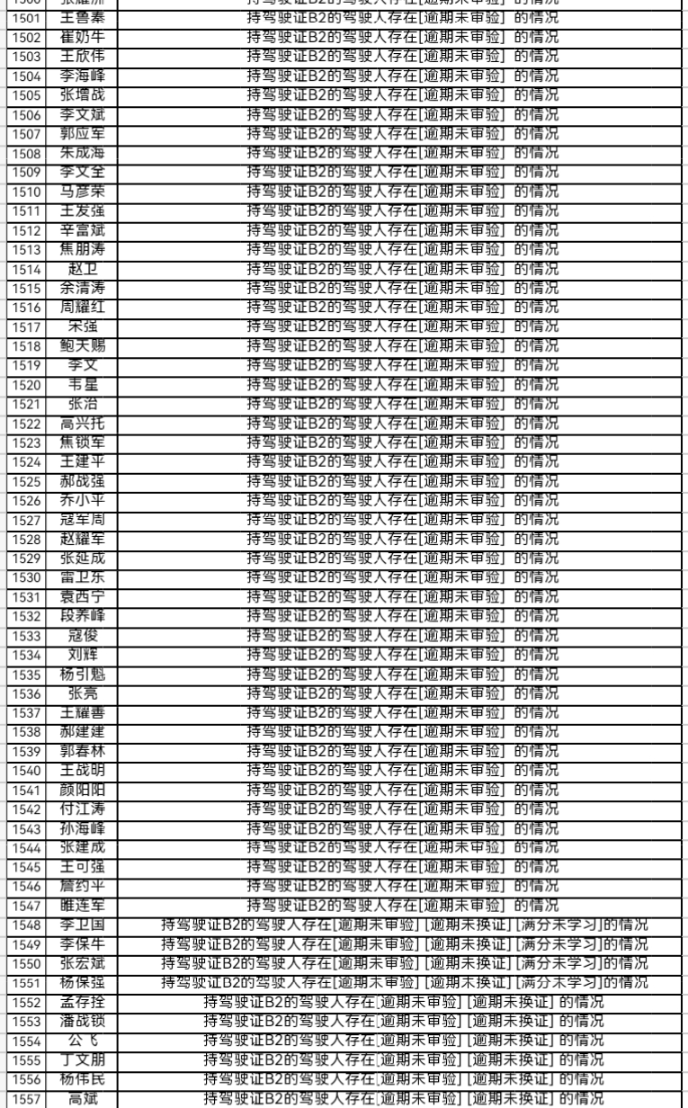 下列AB类机动车驾驶证状态存在“逾期未换证、未审验、满分未学习”情况,为了不影响驾驶证的正常使用,请驾驶人及时向机动车驾驶证核发地或核发地以外的车辆管理所办理换证、审验、满分学习业务(已办理请忽略)。