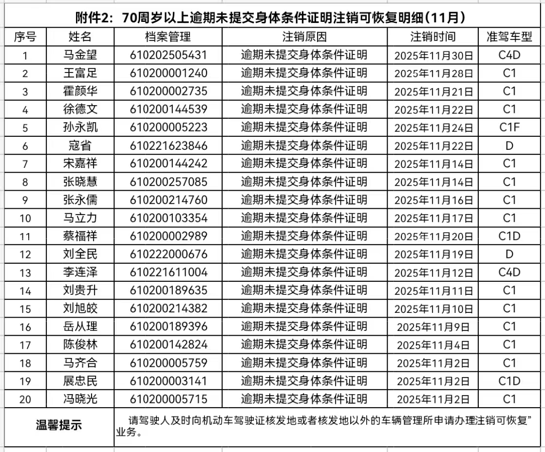 2、“70周岁以上逾期未提交身体条件证明”驾驶证注销可恢复明细