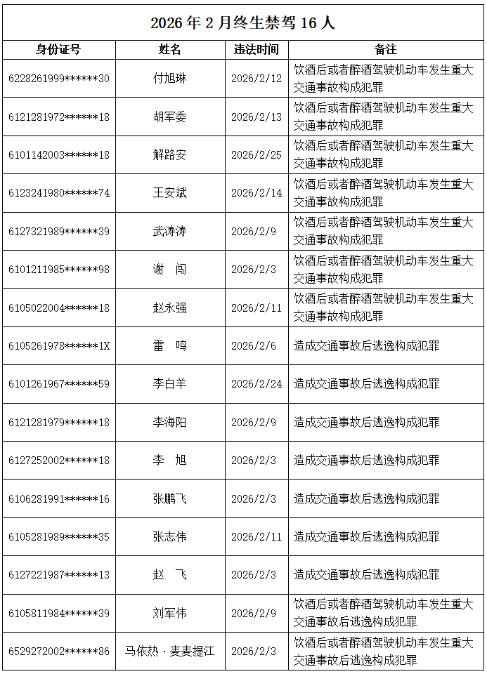2026年2月份终生禁驾名单