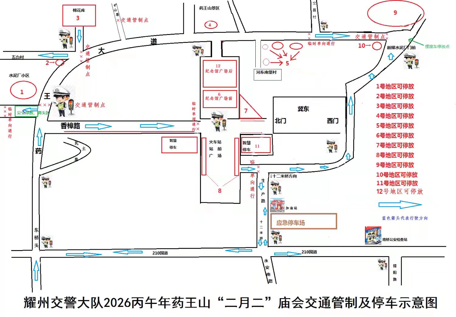 庙会期间,景区周边车流量较大,耀州交警将根据实际情况,对周边路段适时采取交通管制、限行、单幅通行等措施,请广大驾驶员提前关注官方路况发布,行经管制路段时,自觉服从现场交警指挥,有序通行。