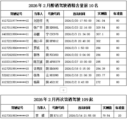 其中,醉酒驾驶602起、饮酒驾驶1819起(含再次饮酒驾驶109起)。7人因饮酒后或者醉酒驾驶机动车发生重大交通事故构成犯罪被终生禁驾,2人因饮酒后或者醉酒驾驶机动车发生重大交通事故后逃逸构成犯罪。现对醉酒驾驶酒精含量前10名及109名再次饮酒人员进行曝光。