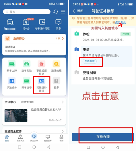 APP申请体检数据上传成功后,打开“交管12123”首页,点击“驾驶证补换领”进入业务流程,仔细核对个人信息,精准勾选“期满换证”,然后点击“下一步”。(注意:转入其它城市网上更便捷哦,仅需点击图二上部分红色箭头处蓝色小字点击此处输入转入地城市名即可。)