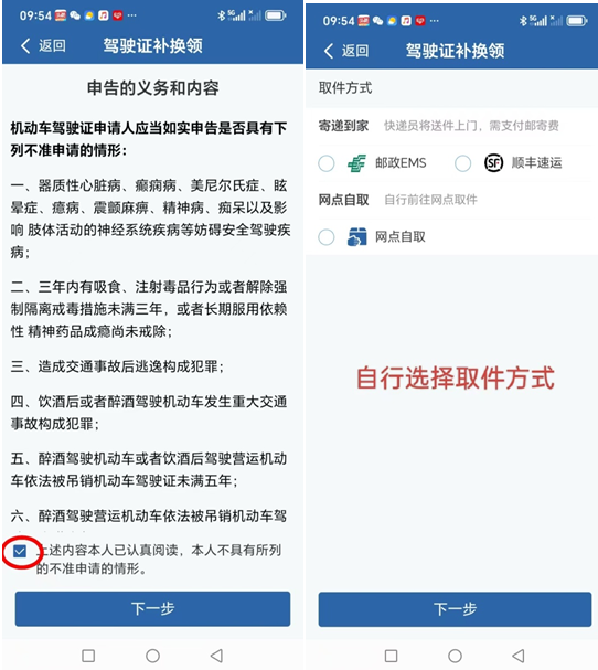 选择取件阅读申告义务后,选择取件方式。可选择网点自取或寄递到家。强烈推荐快递寄递,在家坐等快递小哥上门,省时省力。