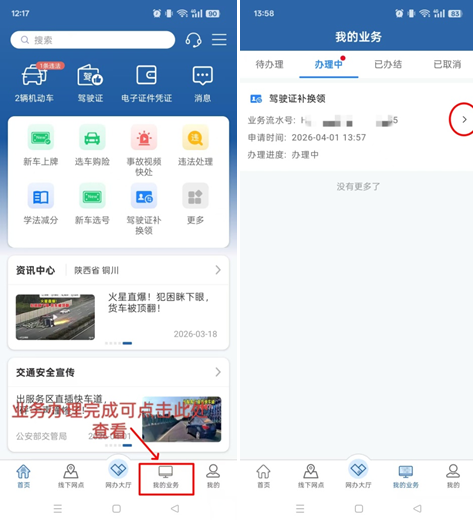 查看进度业务交易支付成功后,申请操作即全部完成,之后可通过我的业务查看业务办理情况。如选择自取的,收到证件制作完成短信后即可前往自取点取证;选择邮寄的可实时查看物流信息。
