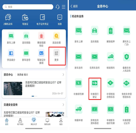 步骤一:APP申请。车主本人登录本人“交管12123”帐户,在首页中部查找“更多”点击进入业务中心,找到补换领行驶证模块,点击进入申请流程,如下图步骤,根据需要选择补领或换领业务类型、填写申请原因并选择取件方式。(注意:如提示系统内无机动车照片的,则不支持交管12123线上申请,需将车开至车管所采集完善照片信息后在现场申请办理。)