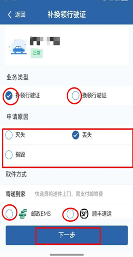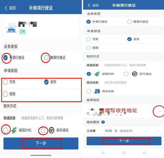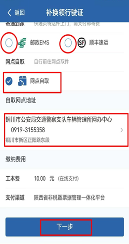 步骤二:选择取件。完成业务选项后,取件方式有寄递到家(请正确填写收件地址并支付邮寄费用)和网点自取(选择自取点)两种方式,可根据自身情况选择最方便的方式。(注意:邮政快递邮费支付方式系统设置为到付,线上并未收取快递费用,收件时需支付。)