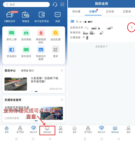 步骤四:查看进度。申请成功后可通过我的业务查看业务办理情况。如选择自取的,收到证件制作完成短信后即可前往自取点取证;选择邮寄的可实时查看物流信息,坐等收件。