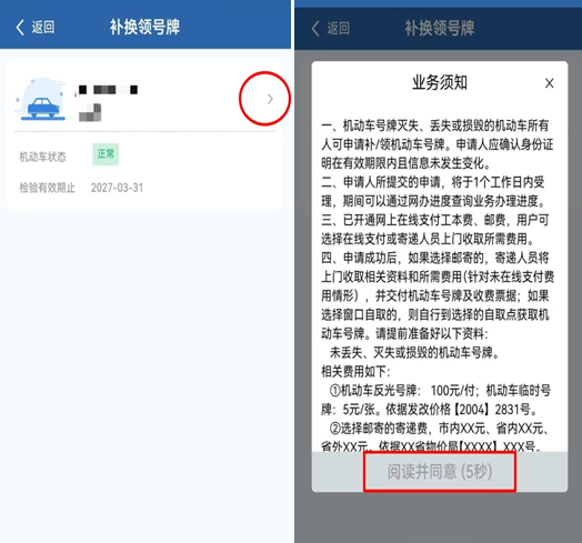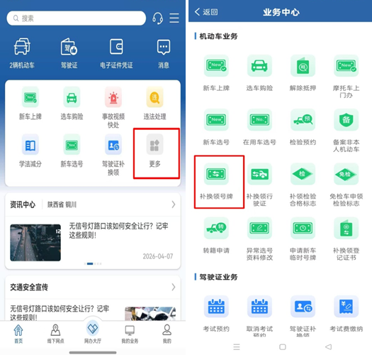 步骤一:APP申请。车主本人登录本人“交管12123”帐户,在首页中部查找“更多”点击进入业务中心,找到补换领号牌模块,点击进入申请流程,如下图步骤,根据需要选择灭失或丢失业务类型、填写申请原因、选择取件方式确认是否需要申领临时号牌。
