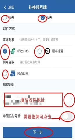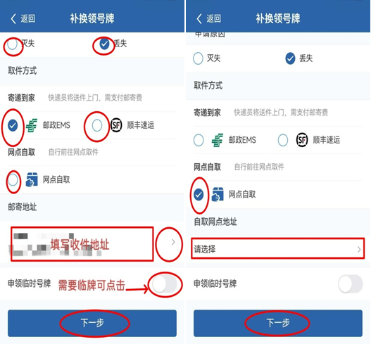 步骤二:选择取件。完成业务选项后,取件方式有寄递到家(请正确填写收件地址并支付邮寄费用)和网点自取(选择自取点)两种方式,可根据自身情况选择最便捷的方式。