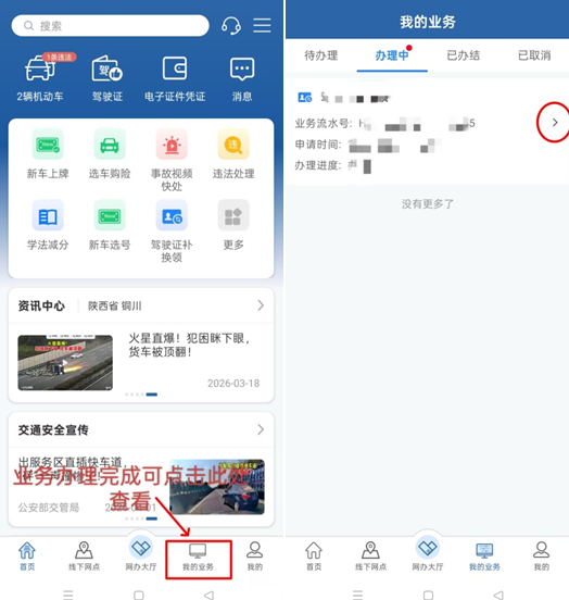 步骤四:查看进度。申请成功后可通过我的业务查看业务办理情况。如选择自取的,收到业务受理完成短信后即可前往号牌自取点领取号牌;选择邮寄的可实时查看物流信息,坐等收件。