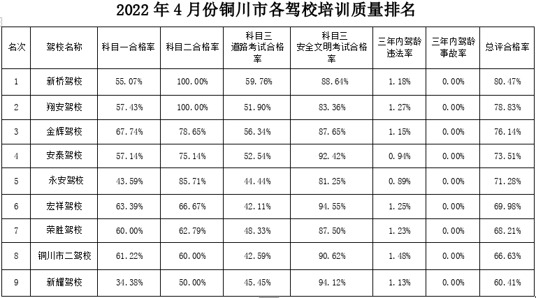 为进一步做好驾考培训工作,根据陕西省公安厅交警总队《关于进一步做好驾考培训质量考核和考试员专业培训相关工作的通知》精神,结合各驾校学员各科目考试合格率、3年内驾龄驾驶人发生交通事故率、3年内驾龄驾驶人交通违法率,铜川市公安局交警支队车管所对各驾校进行了综合分析和排名,现将各驾校培训质量排名公告如下: