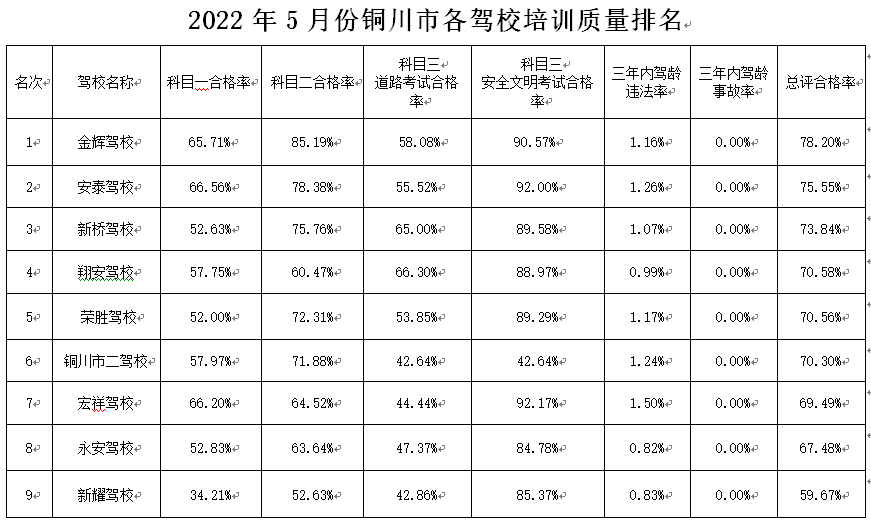 为进一步做好驾考培训工作,根据陕西省公安厅交警总队《关于进一步做好驾考培训质量考核和考试员专业培训相关工作的通知》精神,结合各驾校学员各科目考试合格率、3年内驾龄驾驶人发生交通事故率、3年内驾龄驾驶人交通违法率,铜川市公安局交警支队车管所对各驾校进行了综合分析和排名,现将各驾校培训质量排名公告如下: