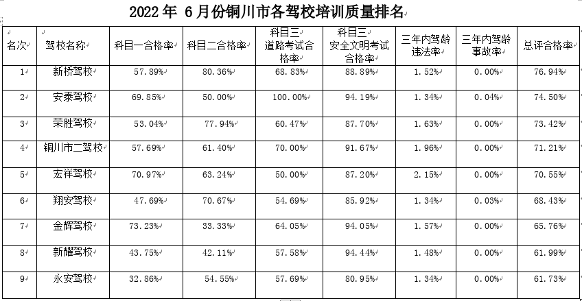 铜川公安交警:6月份铜川市各驾校培训质量排名 公 告