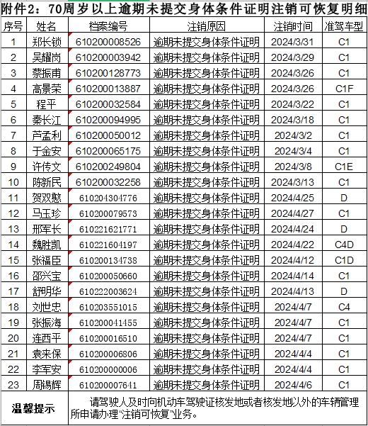 2、“70周岁以上逾期未提交身体条件证明”驾驶证注销可恢复明细