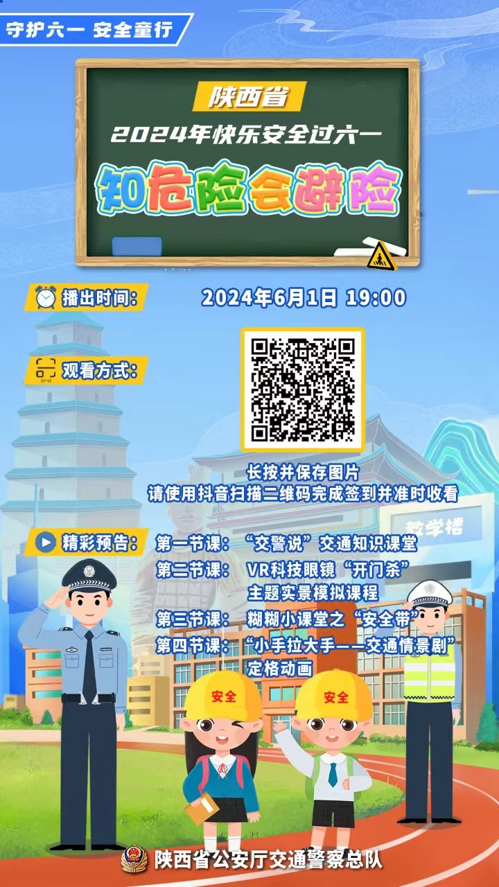 为提高儿童的交通安全意识和自我保护能力,从根源上避免事故的发生,促进儿童健康成长,增强其交通法制观念,在公安部交通管理局指导下,陕西省公安厅交通警察总队在“六·一”国际儿童节来临之际,开展《知危险会避险 快乐安全过六一》交通安全云课堂直播课,通过交通科普、实景模拟、交通情景剧等互动交流,让孩子们做自己的小小安全守护官,知危险会避险,快乐安全成长。公安部交管局新媒体账号、央视少儿新媒体账号、陕西公安交警新媒体账号6月1日(周六)晚上19:00同步直播。