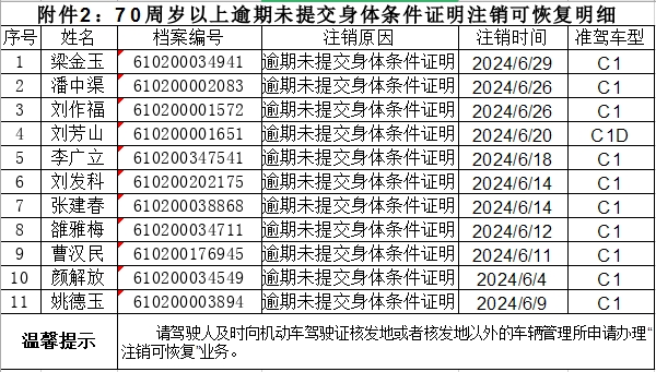 2、“70周岁以上逾期未提交身体条件证明”驾驶证注销可恢复明细