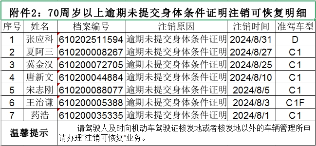 2、“70周岁以上逾期未提交身体条件证明”驾驶证注销可恢复明细