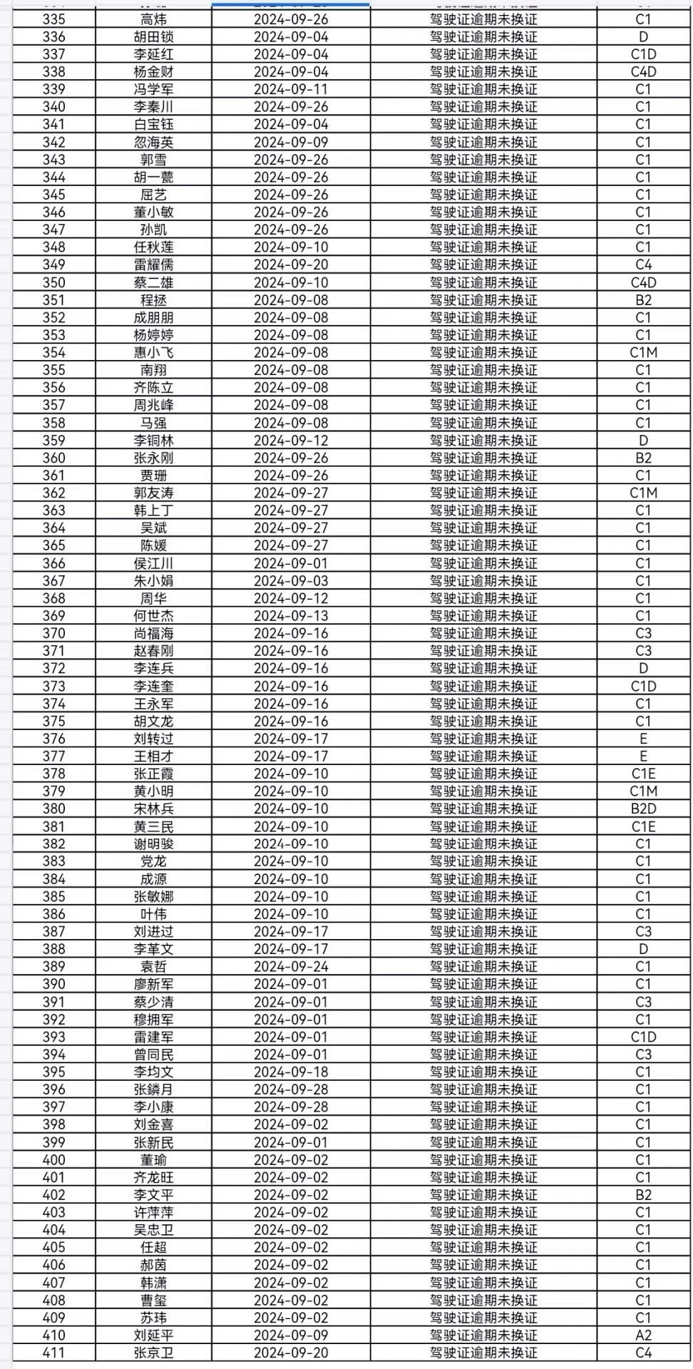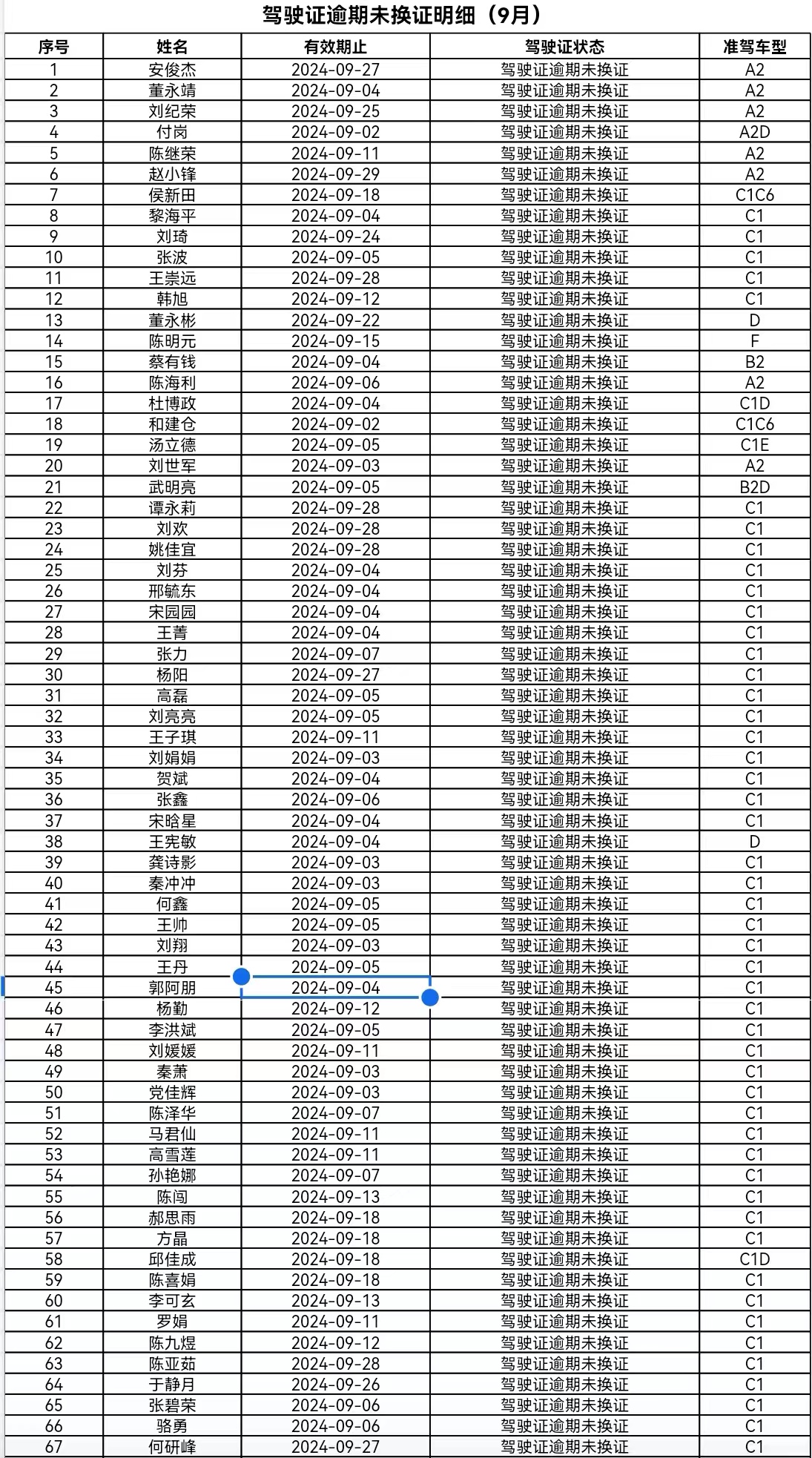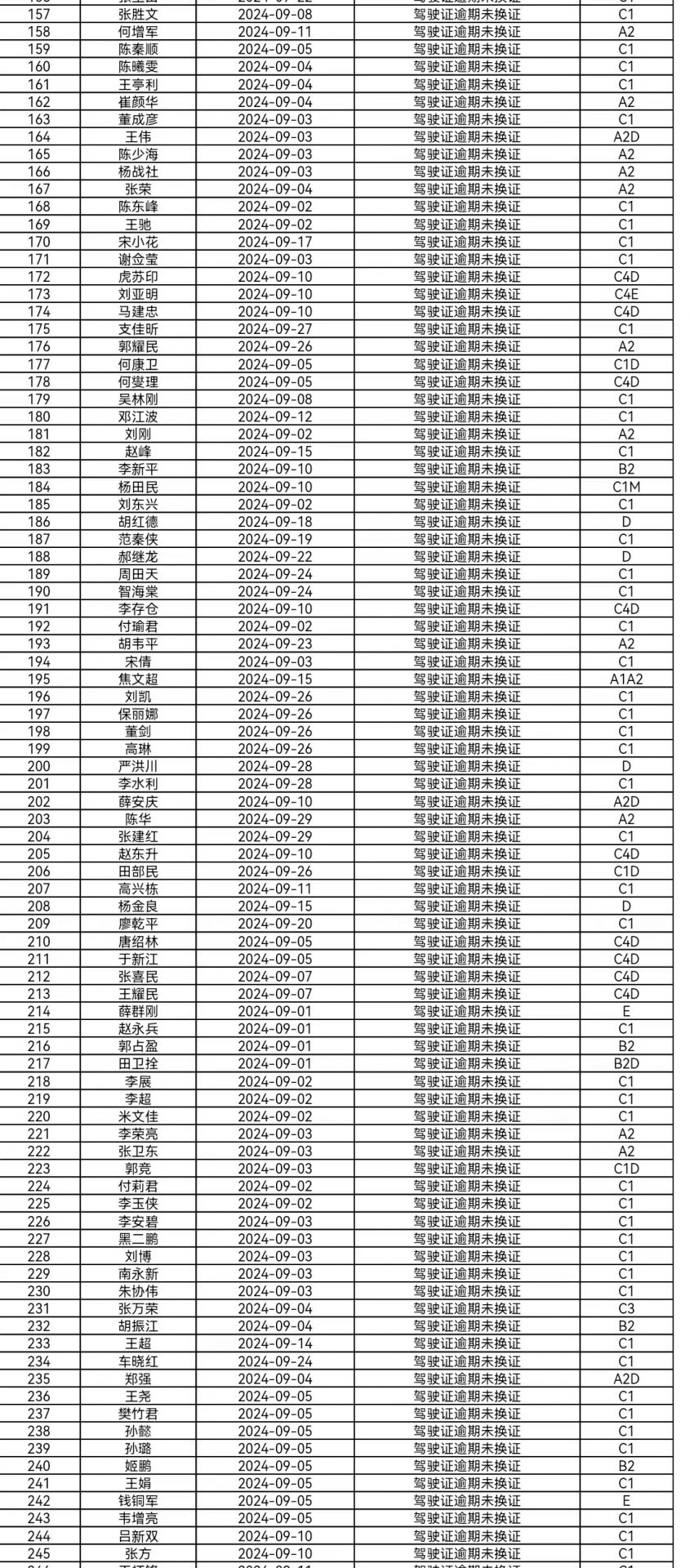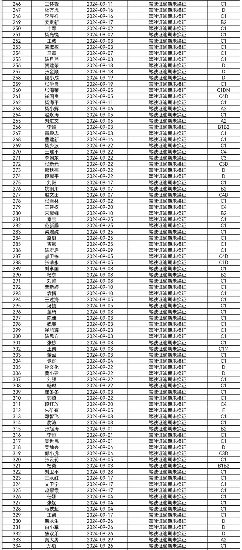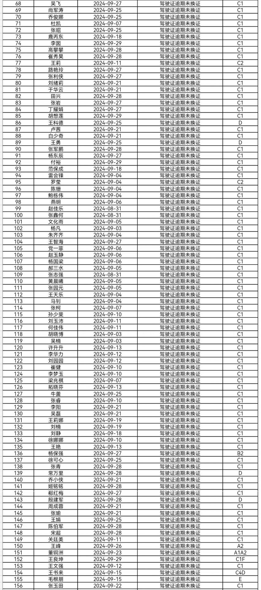 根据公安部第162号《机动车驾驶证申领和使用规定》第六十三条规定,下列2024年9月机动车驾驶证状态均为逾期未换证,为了不影响驾驶证的正常使用,请驾驶人及时向机动车驾驶证核发地或核发地以外的车辆管理所办理换证业务(已办理请忽略)。