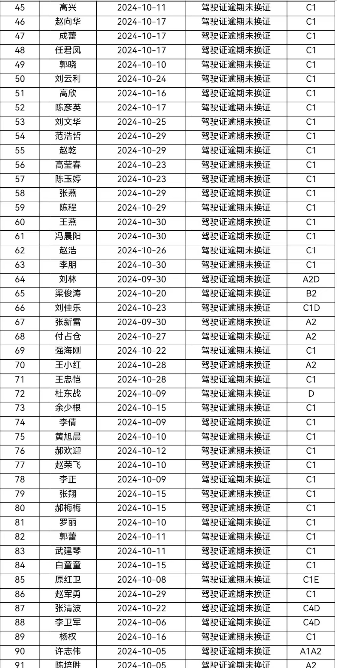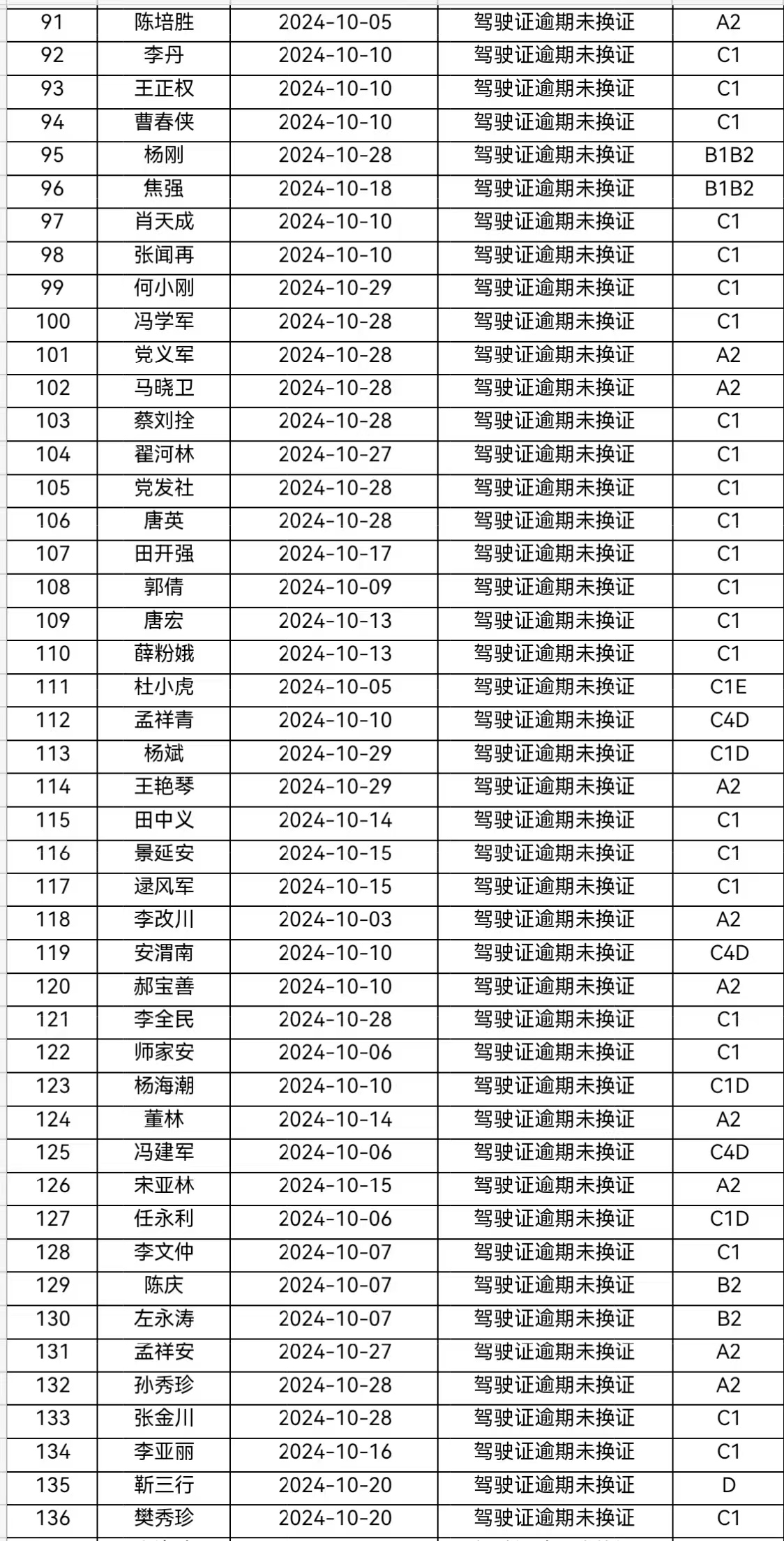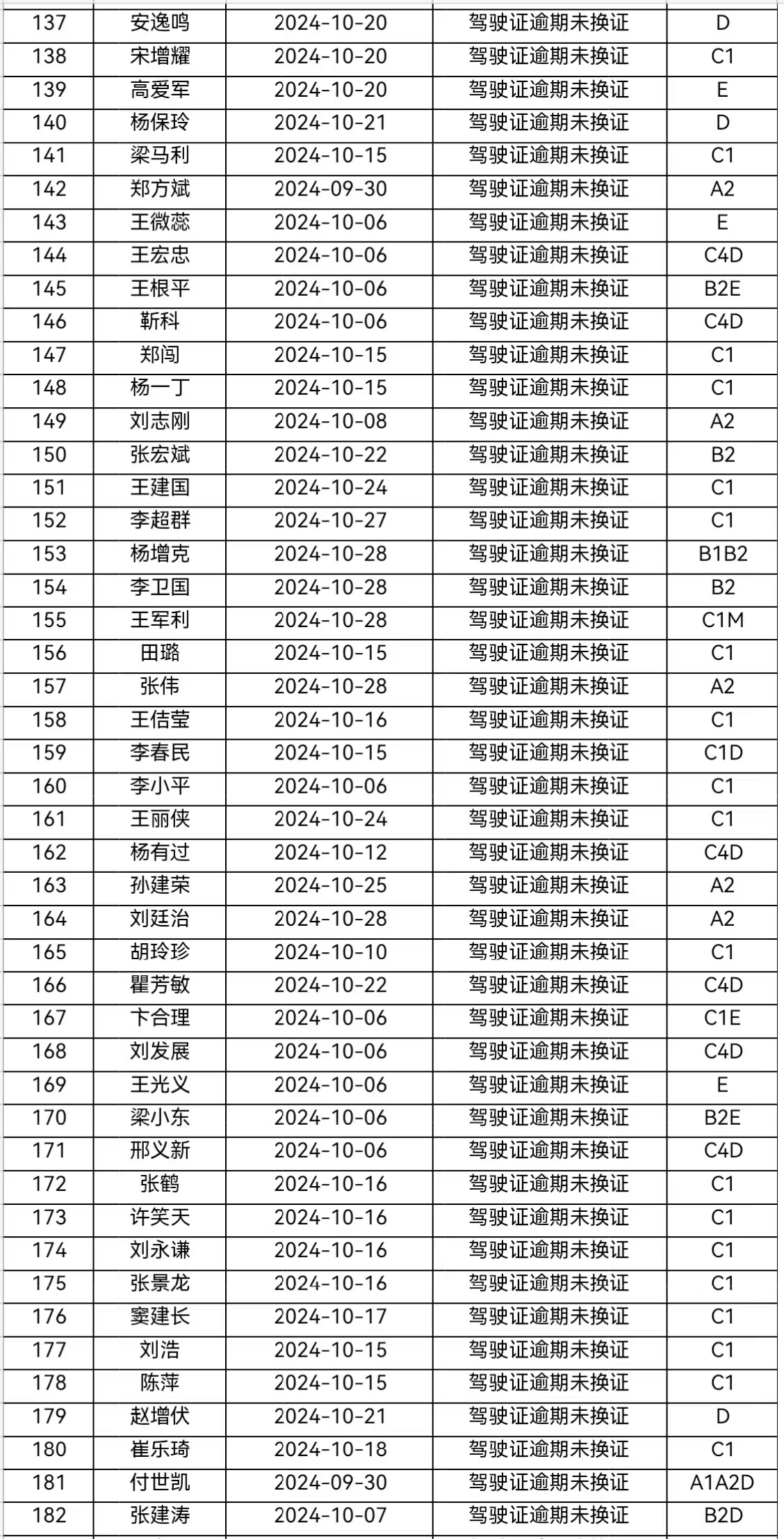 根据公安部第162号《机动车驾驶证申领和使用规定》第六十三条规定,下列2024年10月机动车驾驶证状态均为逾期未换证,为了不影响驾驶证的正常使用,请驾驶人及时向机动车驾驶证核发地或核发地以外的车辆管理所办理换证业务(已办理请忽略)。