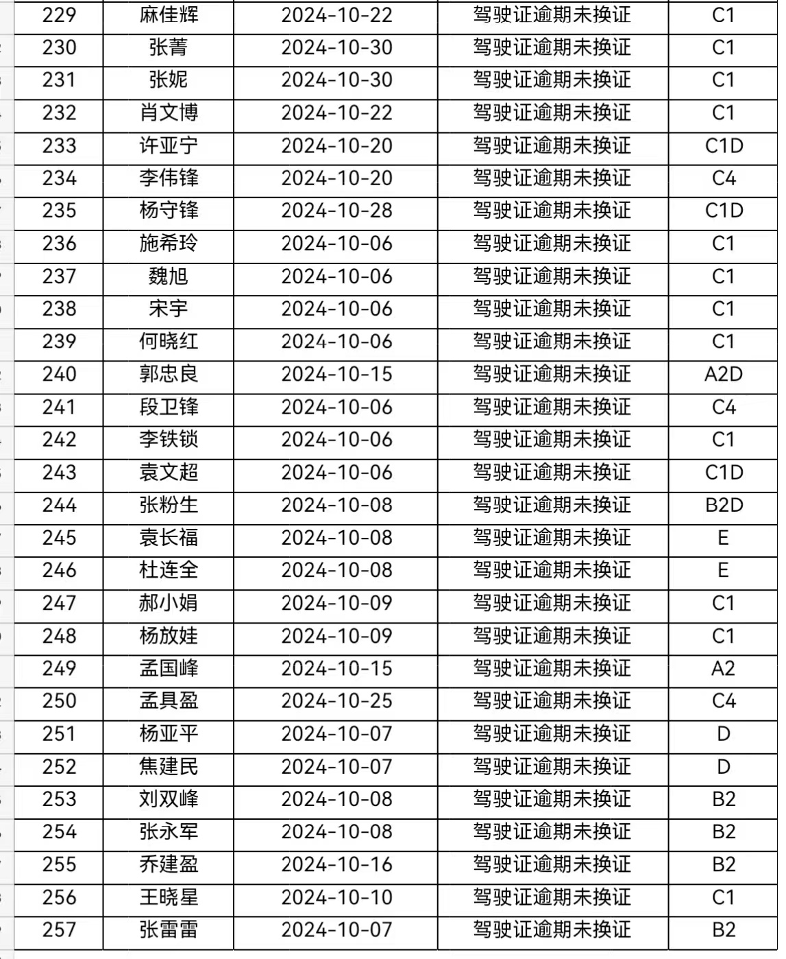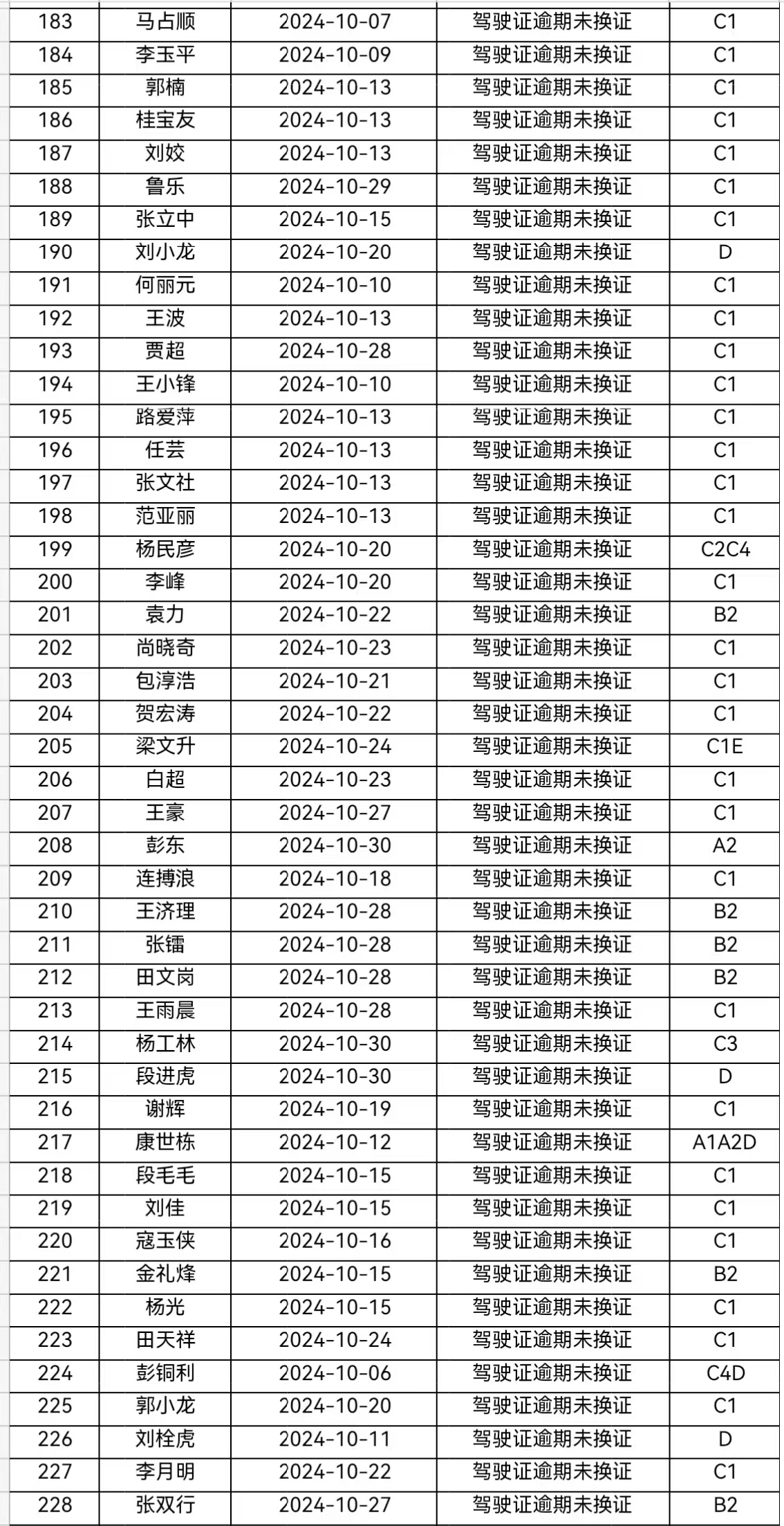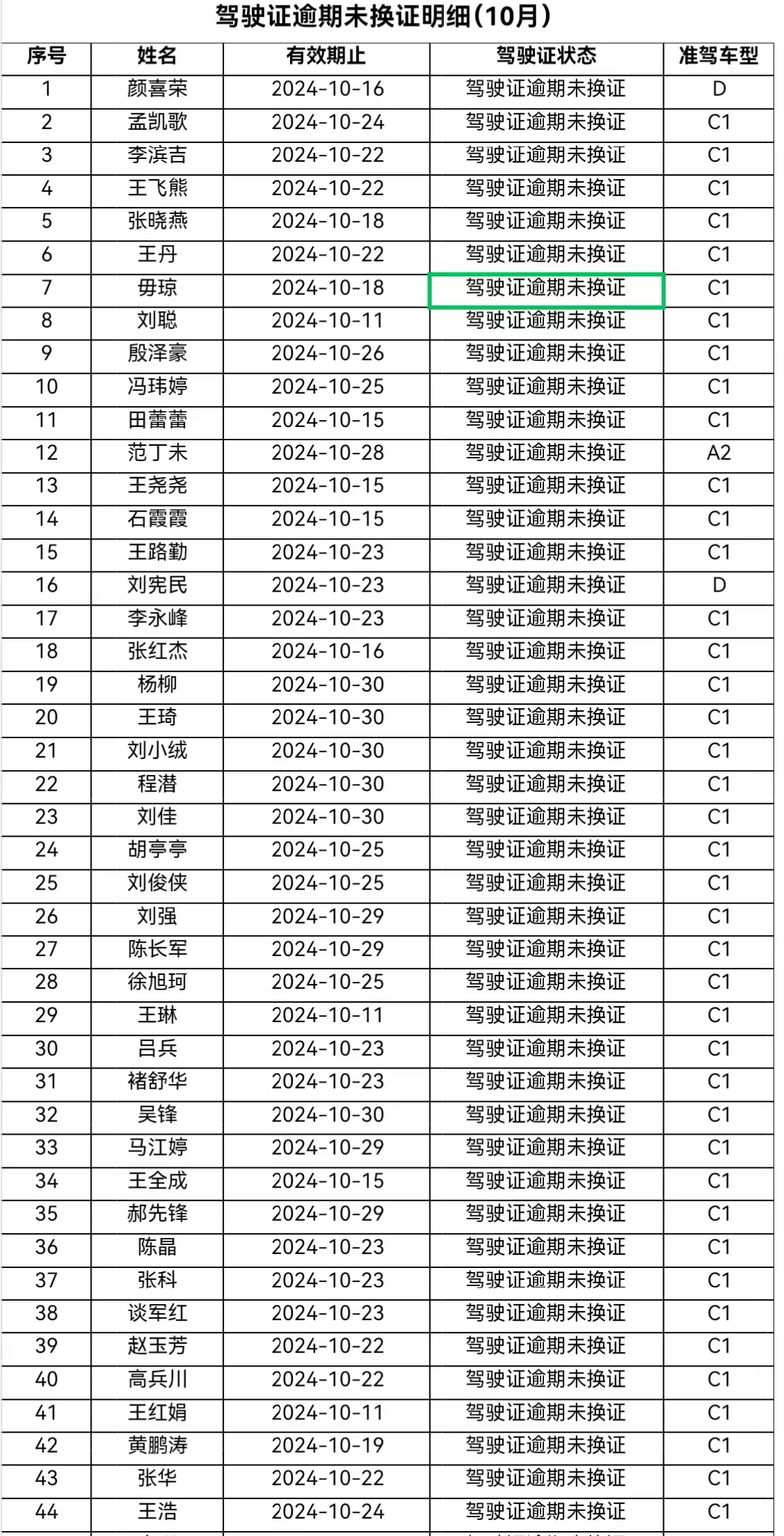 根据公安部第162号《机动车驾驶证申领和使用规定》第六十三条规定,下列2024年10月机动车驾驶证状态均为逾期未换证,为了不影响驾驶证的正常使用,请驾驶人及时向机动车驾驶证核发地或核发地以外的车辆管理所办理换证业务(已办理请忽略)。