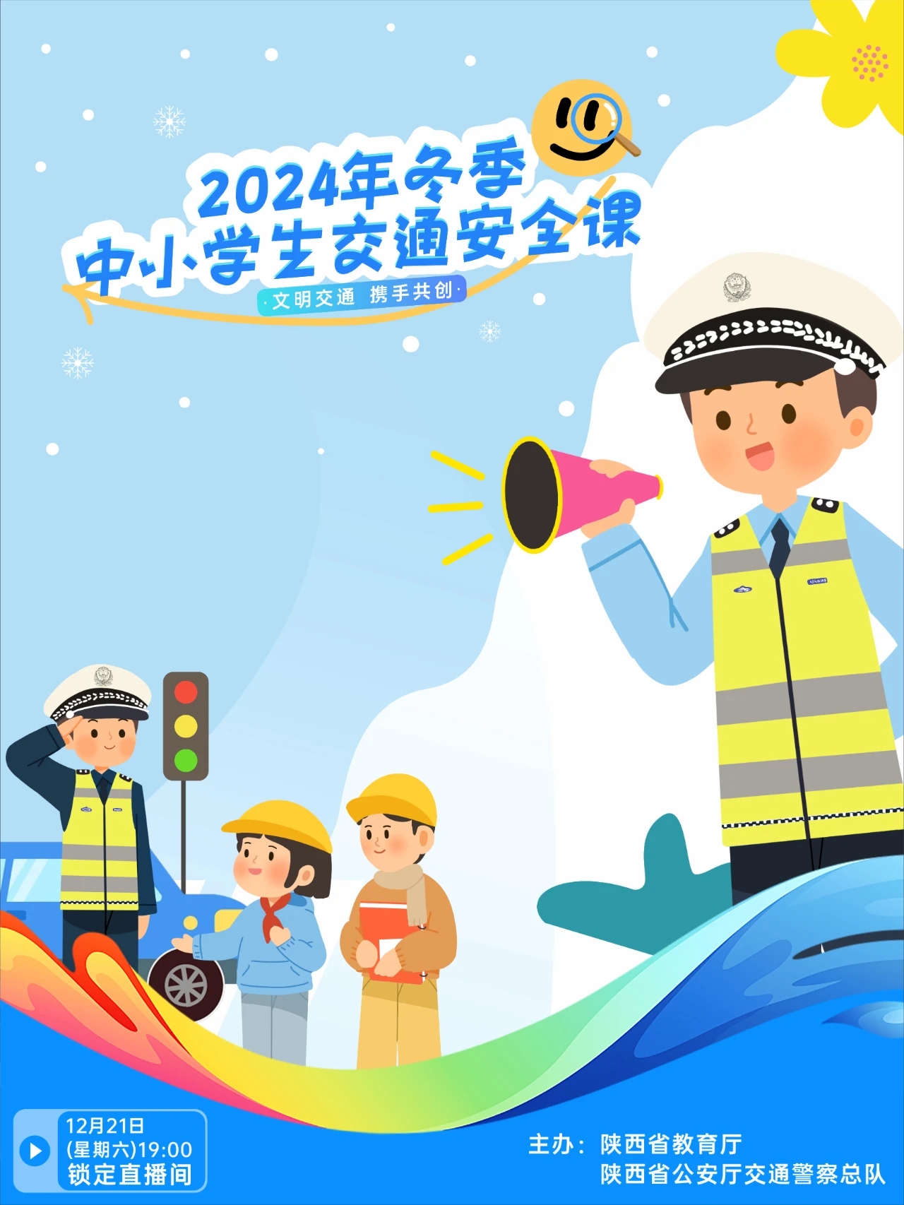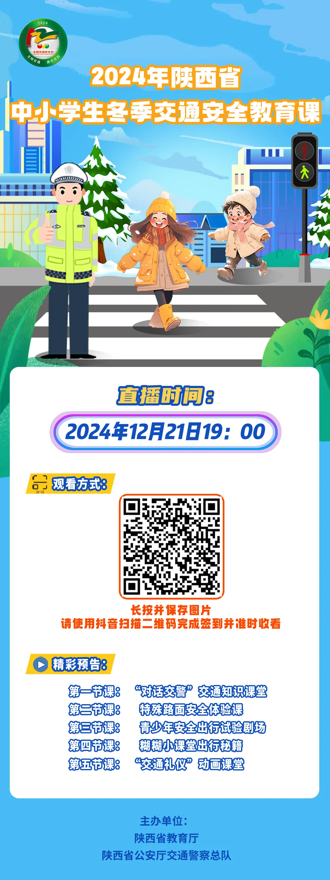 文明交通,携手共创。为做好中小学生冬季道路交通事故预防工作,教育和引导中小学生“知危险 会避险”,预防和减少中小学生冬季道路交通事故的发生,陕西省公安厅交通警察总队联合陕西省教育厅将于12月21日(星期六)19:00通过网上在线的方式,组织开展《2024年陕西省中小学生冬季交通安全教育课》,届时“陕西交警”微博、抖音、微信视频号等平台同步直播。